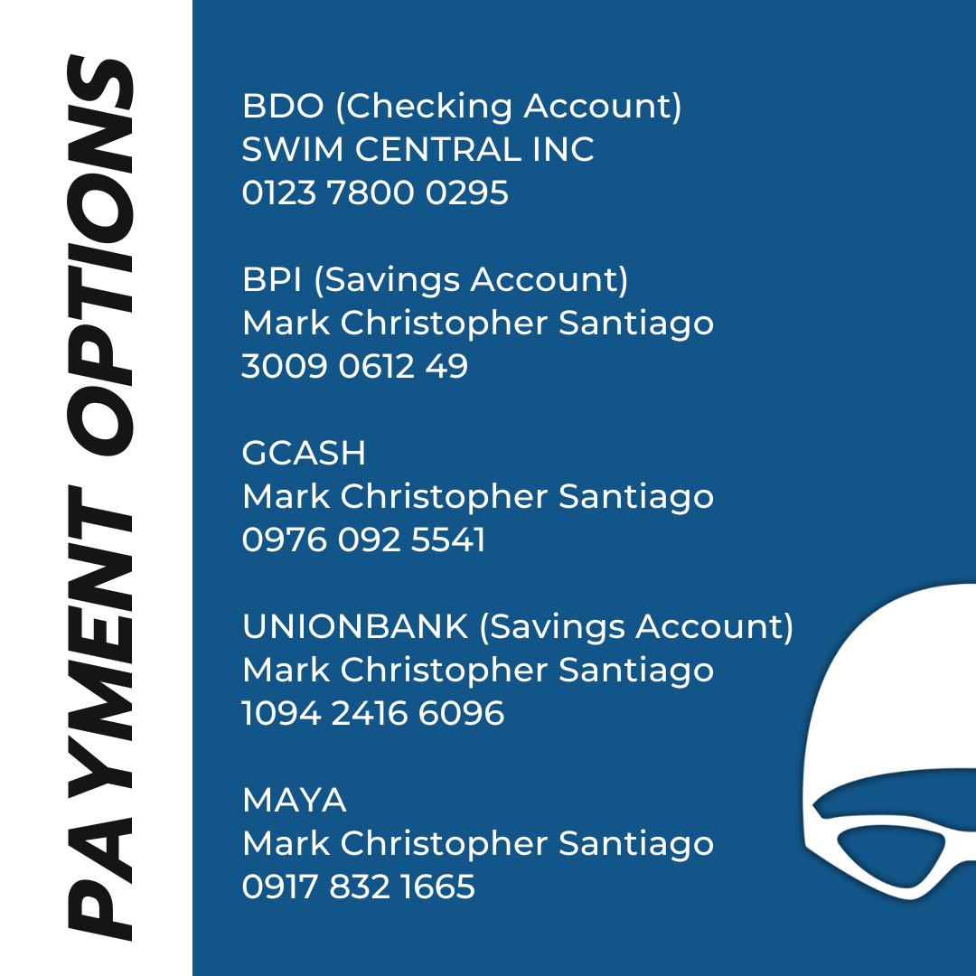 - Take a screenshot of the order confirmation indicating the final amount. - Pay and send a screenshot of the proof of payment via Swim Central messenger or instagram account together with: